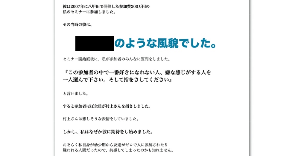八甲田山セミナーでは開始直後、Mr.Xが「このセミナー会場の中で1番キライな人を探して下さい」から始まり、参加者のほぼ全員が村上さんを選んだところから始まる。
