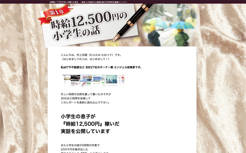 時給12,500円の小学生の話」という内容が公開されており、村上むねつぐさんの小学生の息子が時給12,500円を稼いだ実話が描かれた非常に興味深い内容。また第1章〜第8章までかなりの長文セールスレターです。