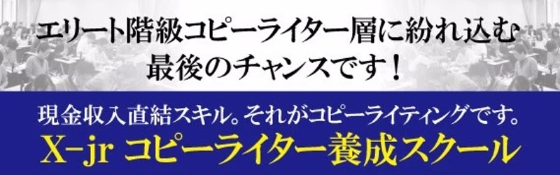 X-Jr.コピーライター養成スクールとは、日本に初めて縦長のセールレター、プロモーショーんを持ち込むんだネットビジネス業界の第一人者である仙人さんが、様々な感情心理学、脳科学、行動学などの知識とスキルを詰め込んだ仙人さん流コピーライティング・メソッドが凝縮されたプログラムです。