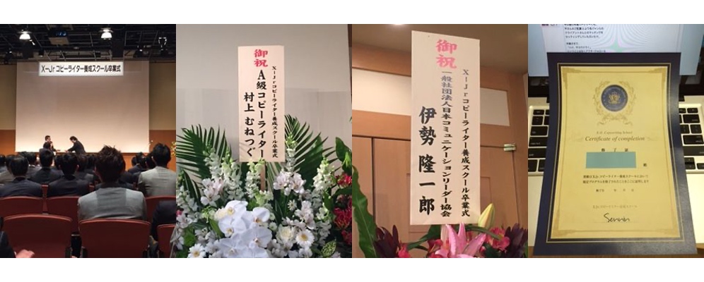入学式から始まり、本編授業、補習講座、中間試験、卒業試験とまさにコピーライターを養成するスクールで、最後には卒業式が盛大に行われ(2015年4月に一期生の卒業式が開催)卒業生には卒業証書やコピーライター免許証が渡されました。